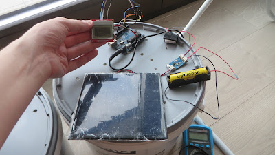 5) Three 3D printed parts: solar panel holder, back lid (with electronics mounted on it) and a tiny bar to fix the solar charger board to the enclosure.