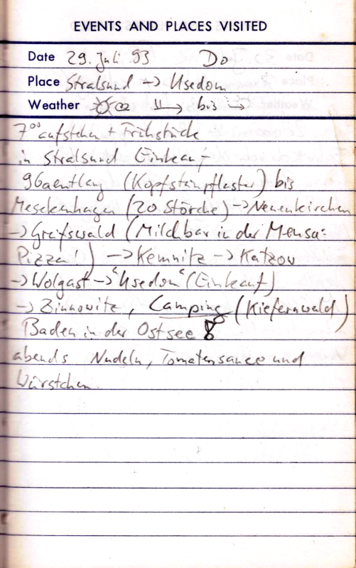 In Greifswald finden wir eine Cafeteria „Milchbar“ in der Uni und snacken Pizza. Das Wetter ist schön und so radeln wir angenehm und für den ersten Tag ziemlich ergiebig bis nach Wolgast und finden unseren ersten Campingplatz im Kiefernwald bei Zinnowitz.