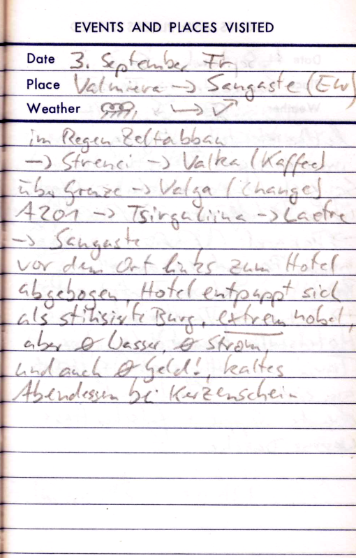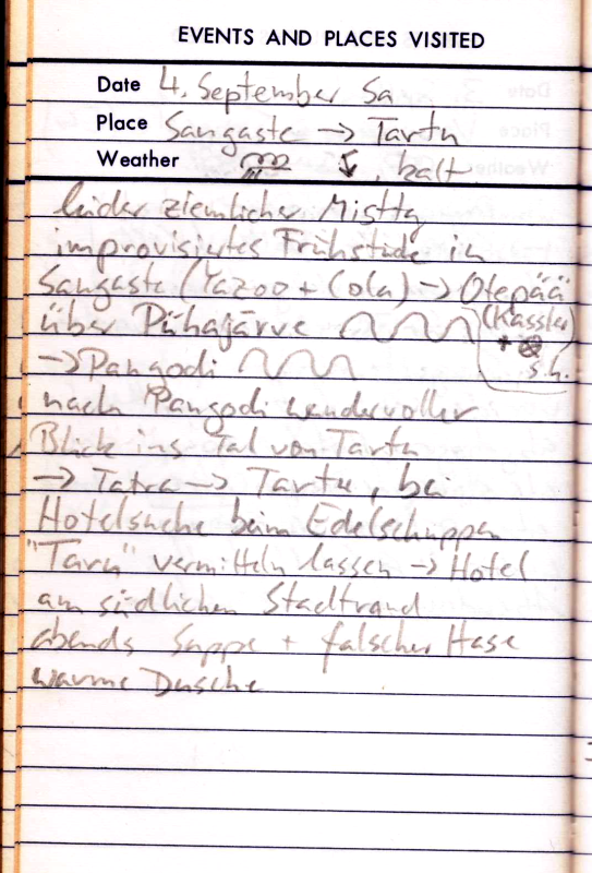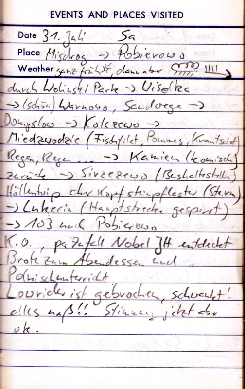 Das Kopfsteinpflaster nervt ungeheuer. Ein Tel der Strecke ist auch noch gesperrt. Heute sind wir abends ziemlich k.o. als wir die Jugendherberge in Pobierowo erreichen. Eine echte Überraschung: Die JH ist neu und nobel. Abends genießen wir noch etwas Polnischunterricht durch die Herbergsfamilie. Die Stimmung hebt das etwas. Dabei ist irgendwie alle pitschnass, Das ärgerlichste ist aber, dass mein Lowrider bei dem Ritt über die schlechten Straßen gebrochen ist. Deshalb werde ich von hier ab bis zum Ende der Tour die kleinen Fronttaschen am Gepäckträger vorne hoch hängen. Das sieht zwar dämlich aus, aber ich bin trotzdem froh, dass mein geliebtes Giant Expedition diese Ausstattung werksseitig bereits vorsieht.
