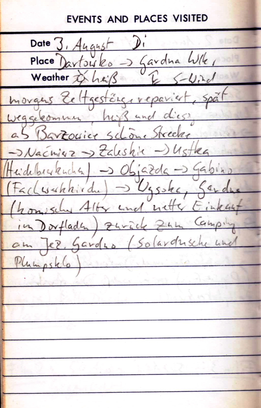Das Wetter ist heute wieder ein heißer Sommertag. Erwähnenswerter Stopp ist Ustka wegen des leckeren Heidelbeerkuchens. Und Gardna mit einer malerischen Fachwerkkirche.