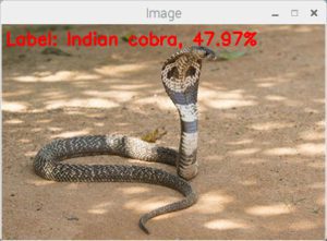 <div class="crayon-main" style=""> <table class="crayon-table"><tr class="crayon-row"><td class="crayon-nums " data-settings="show"> <div class="crayon-nums-content" style="font-size: 12px !important; line-height: 15px !important;"><div class="crayon-num" data-line="crayon-59d706c85484e353162786-1">1</div><div class="crayon-num crayon-striped-num" data-line="crayon-59d706c85484e353162786-2">2</div><div class="crayon-num" data-line="crayon-59d706c85484e353162786-3">3</div><div class="crayon-num crayon-striped-num" data-line="crayon-59d706c85484e353162786-4">4</div><div class="crayon-num" data-line="crayon-59d706c85484e353162786-5">5</div><div class="crayon-num crayon-striped-num" data-line="crayon-59d706c85484e353162786-6">6</div><div class="crayon-num" data-line="crayon-59d706c85484e353162786-7">7</div><div class="crayon-num crayon-striped-num" data-line="crayon-59d706c85484e353162786-8">8</div><div class="crayon-num" data-line="crayon-59d706c85484e353162786-9">9</div><div class="crayon-num crayon-striped-num" data-line="crayon-59d706c85484e353162786-10">10</div></div> </td> <td class="crayon-code"><div class="crayon-pre" style="font-size: 12px !important; line-height: 15px !important; -moz-tab-size:4; -o-tab-size:4; -webkit-tab-size:4; tab-size:4;"><div class="crayon-line" id="crayon-59d706c85484e353162786-1">$ python pi_deep_learning.py --prototxt models/squeezenet_v1.0.prototxt \</div><div class="crayon-line crayon-striped-line" id="crayon-59d706c85484e353162786-2"> --model models/squeezenet_v1.0.caffemodel --labels synset_words.txt \</div><div class="crayon-line" id="crayon-59d706c85484e353162786-3"> --image images/cobra.png </div><div class="crayon-line crayon-striped-line" id="crayon-59d706c85484e353162786-4">[INFO] loading model...</div><div class="crayon-line" id="crayon-59d706c85484e353162786-5">[INFO] classification took 0.91687 seconds</div><div class="crayon-line crayon-striped-line" id="crayon-59d706c85484e353162786-6">[INFO] 1. label: Indian cobra, probability: 0.47972</div><div class="crayon-line" id="crayon-59d706c85484e353162786-7">[INFO] 2. label: leatherback turtle, probability: 0.16858</div><div class="crayon-line crayon-striped-line" id="crayon-59d706c85484e353162786-8">[INFO] 3. label: water snake, probability: 0.10558</div><div class="crayon-line" id="crayon-59d706c85484e353162786-9">[INFO] 4. label: common iguana, probability: 0.059227</div><div class="crayon-line crayon-striped-line" id="crayon-59d706c85484e353162786-10">[INFO] 5. label: sea snake, probability: 0.046393</div></div></td> </tr></table></div> </div>