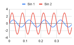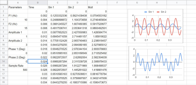 .</p> <p>This allows you to write (and more importantly, edit) one formula that fills in an entire array of data. Another nice feature, if you don&#8217;t like dealing with cell references, is the named range. If you go to Named Ranges on the Data menu you can do things like name A4 as Frequency1 and then use that instead of $A$4 in your other cells.</p> <h2>Graphs</h2> <p>The real fun begins with getting graphical outputs. Spreadsheets are typically good at doing this and you can see from the screenshots that plotting the two sine waves against each other works well. Mixing the two together in column E and graphing that is illustrative, too.</p> <div data-carousel-extra=„{&quot;blog_id&quot;:1,&quot;permalink&quot;:&quot;https:\/\/hackaday.com\/2019\/11\/01\/dsp-spreadsheet-frequency-mixing\/&quot;}“ id=„gallery-1“ class=„gallery galleryid-377912 gallery-columns-2 gallery-size-medium“> <figure class=„gallery-item“><div class=„gallery-icon landscape“><a href=„https://hackaday.com/2019/11/01/dsp-spreadsheet-frequency-mixing/c1/“><img width=„280“ height=„173“ src=„https://hackaday.com/wp-content/uploads/2019/09/c1.png?w=280“ class=„attachment-medium size-medium“ alt=„“ aria-describedby=„gallery-1-378286“ srcset=„https://hackaday.com/wp-content/uploads/2019/09/c1.png 280w, https://hackaday.com/wp-content/uploads/2019/09/c1.png?resize=250,154 250w“ sizes=„(max-width: 280px) 100vw, 280px“ data-attachment-id=„378286“ data-permalink=„https://hackaday.com/2019/11/01/dsp-spreadsheet-frequency-mixing/c1/“ data-orig-file=„https://hackaday.com/wp-content/uploads/2019/09/c1.png“ data-orig-size=„280,173“ data-comments-opened=„1“ data-image-meta=„{&quot;aperture&quot;:&quot;0&quot;,&quot;credit&quot;:&quot;&quot;,&quot;camera&quot;:&quot;&quot;,&quot;caption&quot;:&quot;&quot;,&quot;created_timestamp&quot;:&quot;0&quot;,&quot;copyright&quot;:&quot;&quot;,&quot;focal_length&quot;:&quot;0&quot;,&quot;iso&quot;:&quot;0&quot;,&quot;shutter_speed&quot;:&quot;0&quot;,&quot;title&quot;:&quot;&quot;,&quot;orientation&quot;:&quot;0&quot;}“ data-image-title=„c1“ data-image-description=„“ data-medium-file=„https://hackaday.com/wp-content/uploads/2019/09/c1.png?w=280“ data-large-file=„https://hackaday.com/wp-content/uploads/2019/09/c1.png?w=280“/></a></div> <figcaption class=„wp-caption-text gallery-caption“ id=„gallery-1-378286“>Generated input signals</figcaption></figure><figure class=„gallery-item“><div class=„gallery-icon landscape“><a href=„https://hackaday.com/2019/11/01/dsp-spreadsheet-frequency-mixing/c2/“><img width=„280“ height=„173“ src=„https://hackaday.com/wp-content/uploads/2019/09/c2.png?w=280“ class=„attachment-medium size-medium“ alt=„“ aria-describedby=„gallery-1-378285“ srcset=„https://hackaday.com/wp-content/uploads/2019/09/c2.png 280w, https://hackaday.com/wp-content/uploads/2019/09/c2.png?resize=250,154 250w“ sizes=„(max-width: 280px) 100vw, 280px“ data-attachment-id=„378285“ data-permalink=„https://hackaday.com/2019/11/01/dsp-spreadsheet-frequency-mixing/c2/“ data-orig-file=„https://hackaday.com/wp-content/uploads/2019/09/c2.png“ data-orig-size=„280,173“ data-comments-opened=„1“ data-image-meta=„{&quot;aperture&quot;:&quot;0&quot;,&quot;credit&quot;:&quot;&quot;,&quot;camera&quot;:&quot;&quot;,&quot;caption&quot;:&quot;&quot;,&quot;created_timestamp&quot;:&quot;0&quot;,&quot;copyright&quot;:&quot;&quot;,&quot;focal_length&quot;:&quot;0&quot;,&quot;iso&quot;:&quot;0&quot;,&quot;shutter_speed&quot;:&quot;0&quot;,&quot;title&quot;:&quot;&quot;,&quot;orientation&quot;:&quot;0&quot;}“ data-image-title=„c2“ data-image-description=„“ data-medium-file=„https://hackaday.com/wp-content/uploads/2019/09/c2.png?w=280“ data-large-file=„https://hackaday.com/wp-content/uploads/2019/09/c2.png?w=280“/></a></div> <figcaption class=„wp-caption-text gallery-caption“ id=„gallery-1-378285“>Mix of both signals</figcaption></figure></div> <p>The key is to not try to graph all of the data at one time. The charts in my spreadsheet are doing 200 points (400 ms). Use the Line Chart type and then you can modify things like ranges and headings as you like. Looking at column E probably doesn&#8217;t tell you much, but the graph shows how the signals mix together quite nicely.</p> <p>There are about 10 cycles of the high frequency and at 400mS full scale that works out to 25 Hz, the sum of the 10 and 15 Hz inputs. The larger slower component has two full cycles and that&#8217;s 5 Hz, the difference of the inputs which is just what you&#8217;d expect.</p> <p>You can play with the various parameters to see the effects it has on both graphs. Armed with this kind of math model, you can start tackling other signal processing ideas: filters, IQ modulation and demodulation, and even more. But those are topics for another post.</p> </html>
