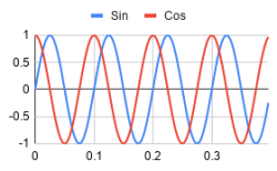 (since it is 90 degrees, or 1/4 of a full circle&#8217;s circumference). Then when you compute the radians the R cancels out leaving &#960;/2 radians. Radians define how much of an arc the angle describes on any circle, no matter the actual size of that circle. If you work the math out, &#960;/4 is 45 degrees, &#960; is 180 degrees, and 2&#960; is a full circle.</p> <p><a href=„https://hackaday.com/wp-content/uploads/2019/09/chart.png“ target=„_blank“><img data-attachment-id=„378281“ data-permalink=„https://hackaday.com/2019/11/01/dsp-spreadsheet-frequency-mixing/chart-5/“ data-orig-file=„https://hackaday.com/wp-content/uploads/2019/09/chart.png“ data-orig-size=„280,173“ data-comments-opened=„1“ data-image-meta=„{&quot;aperture&quot;:&quot;0&quot;,&quot;credit&quot;:&quot;&quot;,&quot;camera&quot;:&quot;&quot;,&quot;caption&quot;:&quot;&quot;,&quot;created_timestamp&quot;:&quot;0&quot;,&quot;copyright&quot;:&quot;&quot;,&quot;focal_length&quot;:&quot;0&quot;,&quot;iso&quot;:&quot;0&quot;,&quot;shutter_speed&quot;:&quot;0&quot;,&quot;title&quot;:&quot;&quot;,&quot;orientation&quot;:&quot;0&quot;}“ data-image-title=„chart“ data-image-description=„“ data-medium-file=„https://hackaday.com/wp-content/uploads/2019/09/chart.png?w=280“ data-large-file=„https://hackaday.com/wp-content/uploads/2019/09/chart.png?w=280“ class=„size-medium wp-image-378281 alignright“ src=„https://hackaday.com/wp-content/uploads/2019/09/chart.png?w=280“ alt=„“ width=„280“ height=„173“ srcset=„https://hackaday.com/wp-content/uploads/2019/09/chart.png 280w, https://hackaday.com/wp-content/uploads/2019/09/chart.png?resize=250,154 250w“ sizes=„(max-width: 280px) 100vw, 280px“/></a>The phase is similar, too. A phase shift of 180 degrees (&#960; radians) will cause the sine wave to be inverted relative to a sine wave with zero shift. A &#960;/2 shift will line up the peak of the shifted sine wave with the zero crossing of the original sine wave. It is worth noting that a -90 degree phase shift of a sine wave is also called a cosine wave. As you can see below, the cosine wave starts at 1 and drops while the sine wave starts at 0 and increases.</p> <h2 class=„c1“>Spreadsheet Tricks</h2> <p>All this math is pretty simple to set up in a spreadsheet. There are at least two ways to go. You can do lots of formulas, or you can use a trick to do one formula for each signal. Either way, you are going to need a timebase.</p> <p>Here&#8217;s my <a href=„https://docs.google.com/spreadsheets/d/1PBfqWA3uWog6UKmmMf9C6Mi0t5kdARIAyUKM0MsSpDg/edit?usp=sharing“ target=„_blank“>signal generation spreadsheet</a>. The timebase is in column B and uses the sample rate in A16. Cell B2 contains a zero. The next cell contains the formula