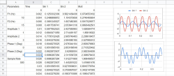 &#160;That would do the same thing and there are many other ways to get the same effect. Either way, it is easy to copy the fromula from one cell then select from B3 to B1000 and paste. Your time base is done.</p> <p>You can do the copy and paste with the signal columns and create a formula to paste. For example, cell C2 could be:</p> <pre>$A$8*sin(2*pi()*$A$4*$B2+radians($A$12)</pre> <p>Then you can copy it all the way down. However, using