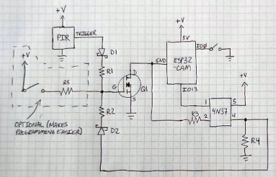 <html> <p>There&#8217;s no shortage of things to like about the ESP8266 and ESP32, but if we had to make a list of the best features these WiFi-enabled microcontrollers have to offer, their power management capabilities would certainly be near the top. Which is how we assumed <a href=„http://marksbench.com/electronics/esp32-cam-low-power-trail-camera/“ target=„_blank“>[Mark] was able to take a whopping 23,475 pictures on his ESP32 camera</a> while powered by nothing more exotic than four AA batteries from the grocery store.</p> <p><a href=„https://hackaday.com/wp-content/uploads/2020/05/esp32cam_detail.png“ target=„_blank“><img data-attachment-id=„413298“ data-permalink=„https://hackaday.com/2020/05/18/esp32-trail-camera-goes-the-distance-on-aa-batteries/esp32cam_detail/“ data-orig-file=„https://hackaday.com/wp-content/uploads/2020/05/esp32cam_detail.png“ data-orig-size=„508,326“ data-comments-opened=„1“ data-image-meta=„{&quot;aperture&quot;:&quot;0&quot;,&quot;credit&quot;:&quot;&quot;,&quot;camera&quot;:&quot;&quot;,&quot;caption&quot;:&quot;&quot;,&quot;created_timestamp&quot;:&quot;0&quot;,&quot;copyright&quot;:&quot;&quot;,&quot;focal_length&quot;:&quot;0&quot;,&quot;iso&quot;:&quot;0&quot;,&quot;shutter_speed&quot;:&quot;0&quot;,&quot;title&quot;:&quot;&quot;,&quot;orientation&quot;:&quot;0&quot;}“ data-image-title=„esp32cam_detail“ data-image-description=„“ data-medium-file=„https://hackaday.com/wp-content/uploads/2020/05/esp32cam_detail.png?w=400“ data-large-file=„https://hackaday.com/wp-content/uploads/2020/05/esp32cam_detail.png?w=508“ class=„alignright size-large wp-image-413298“ src=„https://hackaday.com/wp-content/uploads/2020/05/esp32cam_detail.png?w=508“ alt=„“ width=„508“ height=„326“ srcset=„https://hackaday.com/wp-content/uploads/2020/05/esp32cam_detail.png 508w, https://hackaday.com/wp-content/uploads/2020/05/esp32cam_detail.png?resize=250,160 250w, https://hackaday.com/wp-content/uploads/2020/05/esp32cam_detail.png?resize=400,257 400w“ referrerpolicy=„no-referrer“ /></a>But as it turns out, the full story is quite a bit more interesting. As far as we can tell, [Mark] isn&#8217;t bothering with the ESP32&#8217;s sleep modes all. In fact, it looks like you could pull this trick off with whatever chip you wanted, which certainly makes it worth mentally filing away for the future; even if it depends on a fairly specific use case.</p> <p>In the most simplistic of terms, [Mark] is cutting power to the ESP32 completely when it&#8217;s not actively taking pictures. The clever circuit he&#8217;s come up with only turns on the microcontroller when a PIR sensor detects something moving around in front of the camera. Once the chip is powered up and running code, it brings one of its GPIO pins high which in turn triggers a 4N37 optoisolator connected to the gate on the circuit&#8217;s MOSFET. As long as the pin remains high, the circuit won&#8217;t cut power to the ESP32. This gives the chip time to take the requested number of pictures and get everything in order before bringing the pin low and allowing the circuit to pull the plug.</p> <p>If you&#8217;re looking to maximize runtime without wrangling any MOSFETs, we&#8217;ve seen some excellent examples of <a href=„https://hackaday.com/2017/09/24/datalogger-uses-esp32-and-esp8266-low-power-modes/“>how the low power modes on the ESP8266 and ESP32 can be put to impressive use</a>.</p> <p>[Thanks to Jason for the tip.]</p> </html>