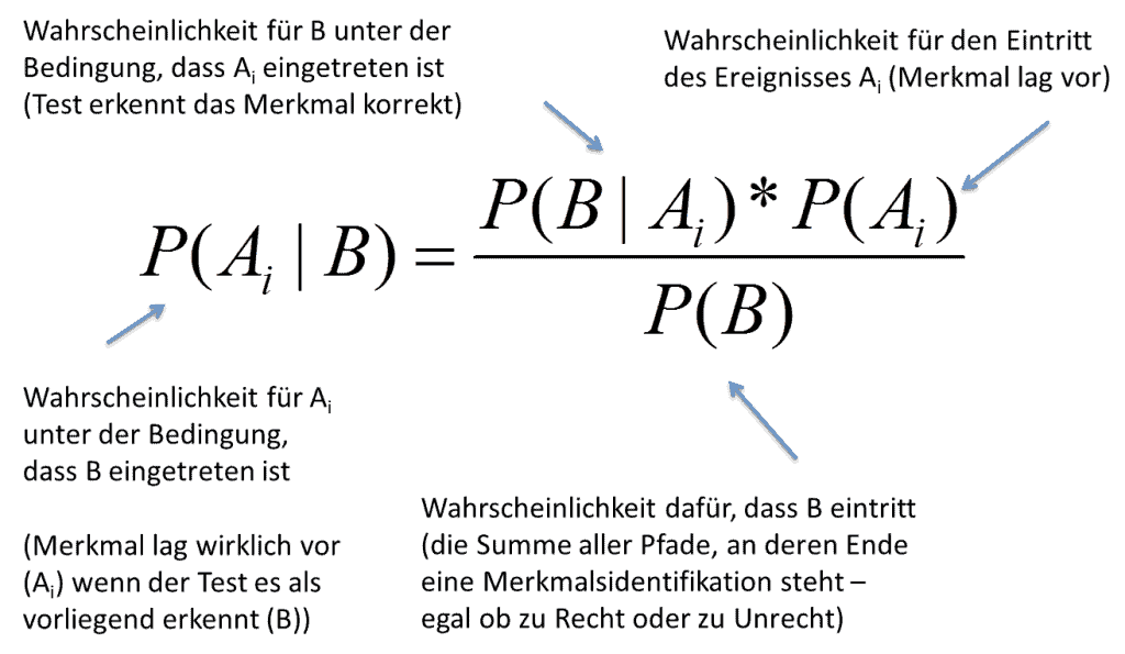 <html> <a href=„https://wissenschafts-thurm.de/grundlagen-der-statistik-der-satz-von-bayes/“><img width=„150“ height=„150“ src=„https://wissenschafts-thurm.de/wp-content/uploads/2016/09/Stichprobe-150x150.jpg“ class=„attachment-thumbnail size-thumbnail wp-post-image“ alt=„“ srcset=„https://wissenschafts-thurm.de/wp-content/uploads/2016/09/Stichprobe-150x150.jpg 150w, https://wissenschafts-thurm.de/wp-content/uploads/2016/09/Stichprobe-300x300.jpg 300w, https://wissenschafts-thurm.de/wp-content/uploads/2016/09/Stichprobe-768x768.jpg 768w, https://wissenschafts-thurm.de/wp-content/uploads/2016/09/Stichprobe-590x590.jpg 590w, https://wissenschafts-thurm.de/wp-content/uploads/2016/09/Stichprobe.jpg 870w“ sizes=„(max-width: 150px) 100vw, 150px“/></a><p>Angenommen, es existiere ein Test auf das Vorhandensein eines genetischen Merkmals, das im hohen Alter eine bestimmte schwere Erkrankung auslöst. Dieser Test identifiziert das Merkmal, das bei 5% der Bevölkerung auftritt, mit einer Sicherheit von 95%. Im Rahmen einer Massenuntersuchung werden 100.000 Personen getestet. Wie groß ist nun die Wahrscheinlichkeit dafür, dass eine als Träger des Merkmals identifizierte Person wirklich über das Merkmal verfügt? Die meisten Menschen würden diese Frage spontan mit 95% beantworten – schließlich ist ja der Test zu 95% sicher, also wird es auch das Ergebnis sein. Der Irrtum, dem wir dabei kollektiv unterliegen, ist die völlige Vernachlässigung der Wahrscheinlichkeit dafür, dass das (mit 5% ja eher seltene) Merkmal überhaupt bei dieser Testperson vorliegt.</p> <p>Die reale Wahrscheinlichkeit für einen Treffer erschließt man sich am besten durch die Betrachtung der absoluten Häufigkeiten:</p> <p><img class=„alignnone size-full wp-image-3518“ src=„https://wissenschafts-thurm.de/wp-content/uploads/2017/01/Baumdiagramm.png“ alt=„Baumdiagramm“ width=„1378“ height=„683“ srcset=„https://wissenschafts-thurm.de/wp-content/uploads/2017/01/Baumdiagramm.png 1378w, https://wissenschafts-thurm.de/wp-content/uploads/2017/01/Baumdiagramm-300x149.png 300w, https://wissenschafts-thurm.de/wp-content/uploads/2017/01/Baumdiagramm-768x381.png 768w, https://wissenschafts-thurm.de/wp-content/uploads/2017/01/Baumdiagramm-1024x508.png 1024w“ sizes=„(max-width: 1378px) 100vw, 1378px“/></p> <p>Von 100.000 Testpersonen verfügen 5% wirklich über das Merkmal – das sind 5.000 Personen. Von diesen 5.000 Personen werden – da der Test zu 95% sicher ist – insgesamt 4.750 Personen korrekterweise als Merkmalsträger erkannt. Da der Test, wenn er zu 95% sicher ist, auch mit 5% irrt, werden von den 95.000 gesunden Testpersonen allerdings auch 5% – dies entspricht ebenfalls 4.750 Personen – fälschlicherweise als Merkmalsträger eingestuft. Alles in allem sind den Testergebnissen zufolge also 4.750 + 4.750 = 9.500 Personen Merkmalsträger, von denen allerdings nur 4.750 Personen (50%) wirklich das Merkmal aufweisen. Die Wahrscheinlichkeit dafür, dass eine Person wirklich das Merkmal aufweist, wenn der Test sie als Merkmalsträger identifiziert, liegt somit nur bei 50% – auch wenn der Test selbst zu 95% sicher ist.</p> <p><ins class=„adsbygoogle c1“ data-ad-format=„fluid“ data-ad-layout-key=„-ek+6d+d-di+nb“ data-ad-client=„ca-pub-5654419668878242“ data-ad-slot=„7673241660“/></p> <p>Die tatsächliche Wahrscheinlichkeit errechnet sich also dadurch, dass man entsprechend der <a href=„http://www.austromath.at/medienvielfalt/materialien/wkeit/lernpfad/033_Laplace.html“ target=„_blank“ rel=„noopener“>klassischen Wahrscheinlichkeitsdefinition nach Laplace</a> die Summe der für das betrachtete Ergebnis relevanten Fälle (Testpersonen mit Merkmal, bei denen das Merkmal diagnostiziert wurde) zu allen Fällen (Testpersonen mit oder ohne Merkmal, bei denen das Merkmal diagnostiziert wurde) in Beziehung setzt. Der Ersatz der absoluten Werte durch die Wahrscheinlichkeiten – unter Berücksichtigung von Additions- und Multiplikationssatz – führt zum gleichen Ergebnis: (0,05*0,95) / 1) = 0,50.</p> <p><img class=„alignnone wp-image-3554“ src=„https://wissenschafts-thurm.de/wp-content/uploads/2017/01/Bayes-Beispiel.png“ alt=„Beispiel zum Satz von Bayes“ width=„500“ height=„117“ srcset=„https://wissenschafts-thurm.de/wp-content/uploads/2017/01/Bayes-Beispiel.png 873w, https://wissenschafts-thurm.de/wp-content/uploads/2017/01/Bayes-Beispiel-300x70.png 300w, https://wissenschafts-thurm.de/wp-content/uploads/2017/01/Bayes-Beispiel-768x180.png 768w“ sizes=„(max-width: 500px) 100vw, 500px“/></p> <p>Aus dieser Überlegung lässt sich der sowohl für das Verständnis der Wahrscheinlichkeitslehre als auch vieler Alltagsprobleme hochgeradig relevante <a href=„https://de.wikipedia.org/wiki/Satz_von_Bayes“ target=„_blank“ rel=„noopener“>Satz von Bayes</a> ableiten:</p> <p><img class=„alignnone size-full wp-image-3505“ src=„https://wissenschafts-thurm.de/wp-content/uploads/2017/01/Satz-von-Bayes.png“ alt=„Formel Satz von Bayes“ width=„1032“ height=„248“ srcset=„https://wissenschafts-thurm.de/wp-content/uploads/2017/01/Satz-von-Bayes.png 1032w, https://wissenschafts-thurm.de/wp-content/uploads/2017/01/Satz-von-Bayes-300x72.png 300w, https://wissenschafts-thurm.de/wp-content/uploads/2017/01/Satz-von-Bayes-768x185.png 768w, https://wissenschafts-thurm.de/wp-content/uploads/2017/01/Satz-von-Bayes-1024x246.png 1024w“ sizes=„(max-width: 1032px) 100vw, 1032px“/></p> <p>Wie aber ist diese Formel richtig zu lesen?</p> <p><img class=„alignnone size-full wp-image-3511“ src=„https://wissenschafts-thurm.de/wp-content/uploads/2017/01/Satz-von-Bayes-1.png“ alt=„Satz von Bayes“ width=„1314“ height=„764“ srcset=„https://wissenschafts-thurm.de/wp-content/uploads/2017/01/Satz-von-Bayes-1.png 1314w, https://wissenschafts-thurm.de/wp-content/uploads/2017/01/Satz-von-Bayes-1-300x174.