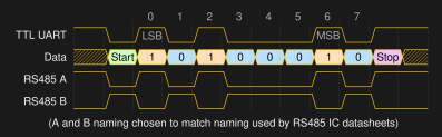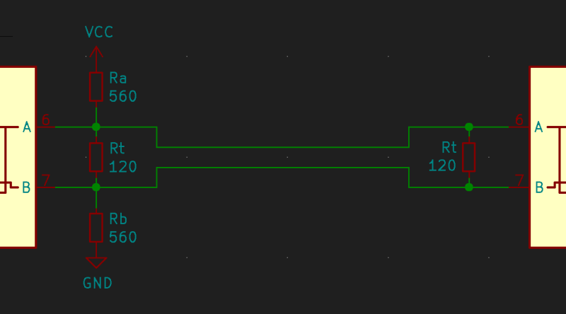 <html> <p>RS485 is a communication standard that should be part of the advanced hardware hacker&#8217;s arsenal; it&#8217;s not commonly encountered, but powerful exactly when you need it. It&#8217;s a physical layer interface for wired communications that uses a single differential pair for noise immunity, has good long-distance properties, and allows many connections to a single bus. Because of that, you will encounter it in <a href=„https://hackaday.com/2019/04/27/this-owner-took-control-of-their-proprietary-alarm-system/“>security systems</a> and <a href=„https://hackaday.io/project/183986-controlling-a-cctv-camera-with-arduino“ target=„_blank“>even cameras</a>, wired sensor networks, <a href=„https://hackaday.com/2021/10/15/learn-dmx512-basics/“>DMX512 lighting</a> and all sorts of industrial electronics. For our hobbyist goals, you can absolutely use RS485 to build your home (or room) automation system, or a relatively large robot &#8211; without all those worries that wireless brings.</p><p>The name might remind you of RS232, and that&#8217;s because both RS232 and RS485 are standards that come from EIA (Electronics Industries Alliance). It also might remind you of RS422, if you&#8217;ve ever seen this name mentioned online &#8211; RS422 and RS485 are closely intertwined, sharing most of the physical layer, and I&#8217;ll show how exactly they relate.</p><h1>Physical Layer</h1><p>At its simplest, a RS485 link is akin to a UART communications channel, but differential and half-duplex, with TX and RX combined into a single communications line. Bytes sent as unclocked data at a pre-arranged baud rate, so your USB-UART adapter or MCU&#8217;s UART peripheral will work for most RS485 purposes. Just like with UART, there are only a few commonly used baud rates, so it should be easy to guess. The differential signal means that you will need to use special transmitters and receivers for working with RS485 links &#8211; they aren&#8217;t pricey, so it&#8217;s wise to have a few in stock before the day when you could really use it.</p><p>One of the main benefits of&#160; RS485 is that you can put multiple devices on a single link. This is a pleasant difference from logic-level UART or RS232, especially for our sensor and other smart device network building needs. The tradeoff is that an RS485 link is half-duplex &#8211; that is, two or more devices cannot transmit at the same moment of time.</p><p>If you ever really need a full-duplex connection, where devices X and Y might want to transmit without regard for each other, you will want to use two RS485 links &#8211; one link for a &#8220;X transmits, Y receives&#8221; direction and other for the &#8220;Y transmits, X receives&#8221; direction, point-to-point style. Congratulations, you&#8217;ve invented RS422, but you&#8217;ve lost the very useful bus nature of RS485.</p><p><img data-attachment-id=„529107“ data-permalink=„https://hackaday.com/2022/04/05/hacker-dictionary-rs-485-will-go-the-distance/haddia_rs485_101_1d/“ data-orig-file=„https://hackaday.com/wp-content/uploads/2022/03/haddia_rs485_101_1d.png“ data-orig-size=„1881,583“ data-comments-opened=„1“ data-image-meta=„{&quot;aperture&quot;:&quot;0&quot;,&quot;credit&quot;:&quot;&quot;,&quot;camera&quot;:&quot;&quot;,&quot;caption&quot;:&quot;&quot;,&quot;created_timestamp&quot;:&quot;0&quot;,&quot;copyright&quot;:&quot;&quot;,&quot;focal_length&quot;:&quot;0&quot;,&quot;iso&quot;:&quot;0&quot;,&quot;shutter_speed&quot;:&quot;0&quot;,&quot;title&quot;:&quot;&quot;,&quot;orientation&quot;:&quot;0&quot;}“ data-image-title=„haddia_rs485_101_1d“ data-image-description=„“ data-image-caption=„“ data-medium-file=„https://hackaday.com/wp-content/uploads/2022/03/haddia_rs485_101_1d.png?w=400“ data-large-file=„https://hackaday.com/wp-content/uploads/2022/03/haddia_rs485_101_1d.png?w=800“ class=„aligncenter wp-image-529107 size-large“ src=„https://hackaday.com/wp-content/uploads/2022/03/haddia_rs485_101_1d.png?w=800“ alt=„Timing diagram for TTL UART data and corresponding RS485 signals“ width=„800“ height=„248“ srcset=„https://hackaday.com/wp-content/uploads/2022/03/haddia_rs485_101_1d.png 1881w, https://hackaday.com/wp-content/uploads/2022/03/haddia_rs485_101_1d.png?resize=250, 77 250w, https://hackaday.com/wp-content/uploads/2022/03/haddia_rs485_101_1d.png?resize=400, 124 400w, https://hackaday.com/wp-content/uploads/2022/03/haddia_rs485_101_1d.png?resize=800, 248 800w, https://hackaday.com/wp-content/uploads/2022/03/haddia_rs485_101_1d.png?resize=1536, 476 1536w“ referrerpolicy=„no-referrer“ /></p><p>Signals are transmitted <em>differentially</em>. In place of one signal, there are two signals: one is always opposite the other &#8211; when you transmit a high logic level, line A goes high and line B goes low, and when you transmit a low logic level, line A goes low and line B goes high. The receiver doesn&#8217;t measure the absolute level of the signals relative to ground &#8211; instead, it measures the difference between them. We have <a href=„https://hackaday.com/2016/03/29/when-difference-matters/“>talked about differential pairs before</a>, explaining their benefits like high noise reduction. Using differential pairs is what allows for RS485 links hundreds of meters long that you will see people online brag about building!</p><p><img data-attachment-id=„529115“ data-permalink=„https://hackaday.com/2022/04/05/hacker-dictionary-rs-485-will-go-the-distance/hadimg_rs485_101_thumb/“ data-orig-file=„https://hackaday.com/wp-content/uploads/2022/03/hadimg_rs485_101_thumb.jpg“ data-orig-size=„1200,1200“ data-comments-opened=„1“ data-image-meta=„{&quot;aperture&quot;:&quot;0&quot;,&quot;credit&quot;:&quot;&quot;,&quot;camera&quot;:&quot;&quot;,&quot;caption&quot;:&quot;&quot;,&quot;created_timestamp&quot;:&quot;0&quot;,&quot;copyright&quot;:&quot;&quot;,&quot;focal_length&quot;:&quot;0&q