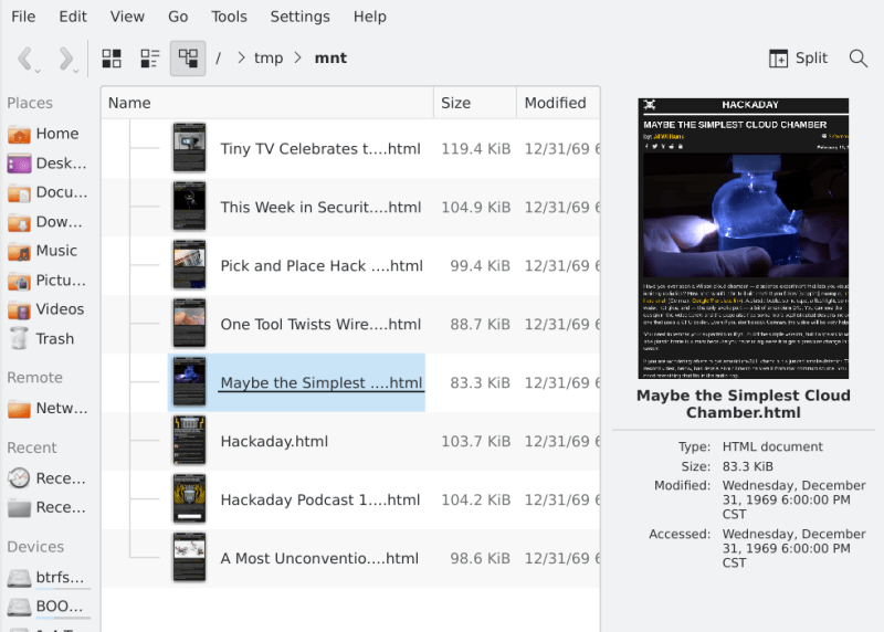 global variable tells how many stories we’ve actually loaded.</p><pre class=„brush: cpp; title: ; notranslate“ title=„“> The curl line to read our feedstatic char cmd[]=„curl https://hackaday.com/feed/ 2>/dev/null | egrep '(<title>;)|(<link>)'“; User initialization–read the feed (note that init is reserved by the FUSE library)int HaDFS::userinit(void){ FILE *fp; char buf[1024]; working buffer for reading strings if (!( fp = popen(cmd,„r“) )) return 1; open pipe while ( fgets(buf,sizeof(buf),fp) ) { string line = buf; line = trimrss(line); trim off extra stuff if ( line.substr(0,7) == „<title>“ ) identify line type and process { topic[topics].title = line.substr(7); topic[topics].title += „.html“; } else if (line.substr(0,6)==„<link>“) { topic[topics].url = line.substr(6); topics++; if ( topics == MAXTOPIC ) break; quietly truncate a long feed } } pclose(fp); return 0;} </pre><p>The <code>popen</code> function runs a command line and gives us the <code>stdout</code> stream as a bunch of lines. Processing the lines is just brute force looking for <title> and <link> to identify the data we need. I filtered <code>curl</code> through <code>grep</code> to make sure I didn’t get a lot of extra lines, by the way, and I assumed lowercase, but a <code>-i</code> option could easily fix that. The redirect is to prevent <code>curl</code> from polluting <code>stderr</code>, although normally FUSE will disconnect the output streams so it doesn’t really matter. Note that I add an HTML extension to each fake file name so opening one is more likely to get to the browser.</p><p>By putting a <code>printf</code> in the code I was able to make sure the feed fetching was working the way I expected. Note that I don’t fetch the actual pages until later in the process. For now, I just want the titles and the URL links.</p><h2>The Four Functions</h2><p>There are four functions we need to create in a subclass to get a minimal read-only filesystem going: <code>getattr</code>, <code>readdir</code>, <code>open</code>, and <code>read</code>. These functions pretty much do what you expect.  The <code>getattr</code> call will return 755 for our root (and only) directory and 444 for any other file that exists. The <code>readdir</code> outputs entries for . and .. along with our “files.” <code>Open</code> and <code>read</code> do just what you think they do.</p><p>There are some other functions, but those are ones I added to help myself:</p><ul><li><code>userinit</code> – Called to kick off the file system data</li><li><code>trimrss</code> – Trim an RSS line to make it easier to parse</li><li><code>pathfind</code> – Turn a file name into a descriptor (an index into the array of topics)</li><li><code>readurl</code> – Return a string with the contents of a URL (uses curl)</li></ul><p>There’s not much to it. You’ll see in the code that there are a few things to look out for like catching someone trying to write to a file since that isn’t allowed.</p><h2>Debugging and Command Line Options</h2><p>Of course, it doesn’t matter how simple it is, it isn’t going to work the first time is it? Of course, first, you have to remember to put the call to <code>fs.run</code> back in the main function. But, of course, things won’t work like you expect for any of a number of reasons. There are a few things to remember as you go about running and debugging.</p><p>When you build your executable, you simply run it and provide a command line argument to specify the mount point which, of course, should exist. I have a habit of using <code>/tmp/mnt</code> while debugging, but it can be anywhere you have permissions.</p><p>Under normal operation, FUSE detaches your program so you can’t just kill it. You’ll need to use unmount command (<code>fusermount -u</code>) with the mount point as an argument. Even if your program dies with a segment fault, you’ll need to use the unmount command or you will probably get the dreaded “disconnected endpoint” error message.</p><p>Being detached leads to a problem. If you put <code>printf</code> statements in your code, they will never show up after detachment. For this reason, FUSE understands the <code>-f</code> flag which tells the system to keep your filesystem running in the foreground. Then you can see messages and a clean exit, like a Control+C, will cleanly unmount the filesystem. You can also use <code>-d</code> which enables some built-in debugging and implies <code>-f</code>. The <code>-s</code> flag turns off threading which can make debugging easier, or harder if you are dealing with a thread-related problem.</p><p>You can use <code>gdb</code>, and there are some <a href=„https://blog.jeffli.me/blog/2014/08/30/use-gdb-to-understand-fuse-file-system/“ target=„_blank“>good articles</a> about that. But for such a simple piece of code, it isn’t really necessary.</p><h2>What’s Next?</h2><p>The documentation for the library is almost nothing. However, the library closely mirrors the <code>libfuse</code> API so the documentation for that (mostly in <a href=„http://libfuse.github.io/doxygen/fuse-3_810_84_2include_2fuse_8h.html“ target=„_blank“>fuse.h</a>) will help you go further. If you want to graduate from FUSE to a “real” file system, you have a long road. The video below gives some background on Linux VFS, but that’s just the start down that path.</p><p><iframe class=„youtube-player c1“ width=„800“ height=„480“ src=„https://www.youtube.com/embed/J4qWNNISdJk?version=3&rel=1&showsearch=0&showinfo=1&iv_load_policy=1&fs=1&hl=en-US&autohide=2&wmode=transparent“ allowfullscreen=„allowfullscreen“ sandbox=„allow-scripts allow-same-origin allow-popups allow-presentation“>[embedded content]</iframe></p><p>Maybe stick to FUSE for a while. If you prefer Python, <a href=„https://hackaday.com/2013/11/06/writing-a-fuse-filesystem-in-python/“>no problem</a>. FUSE is very popular for mapping <a hr