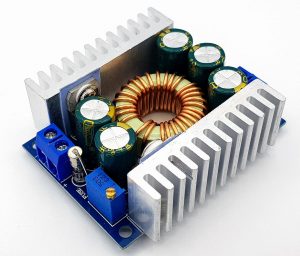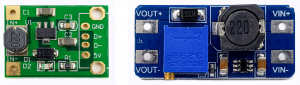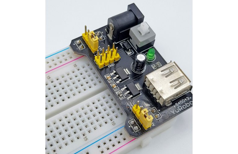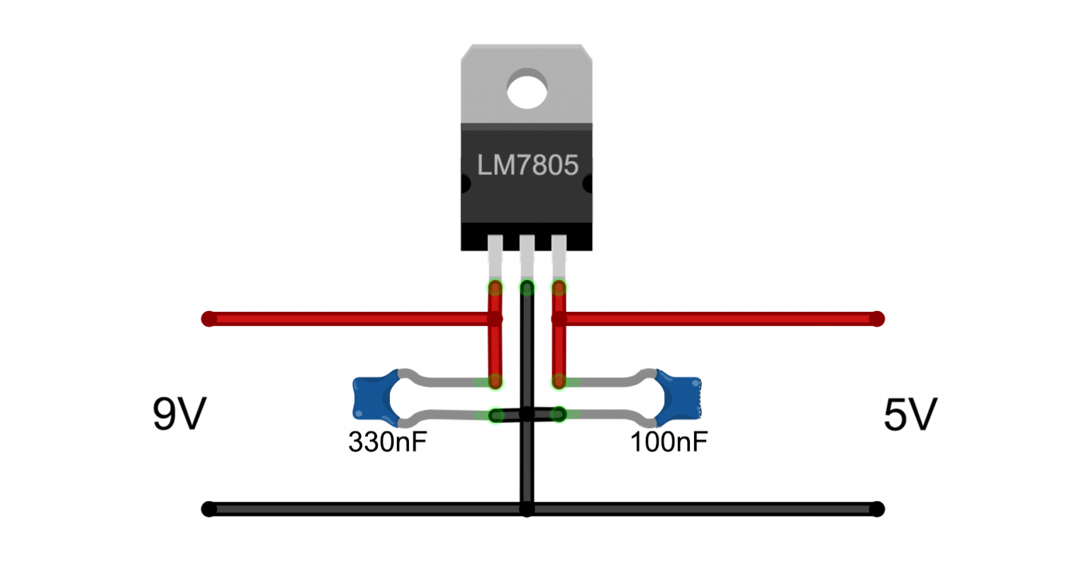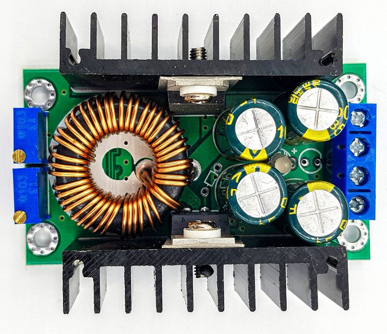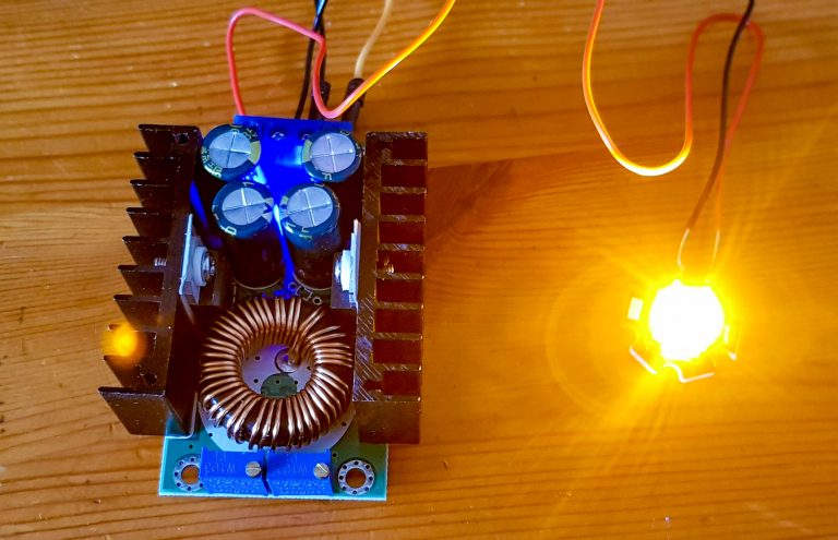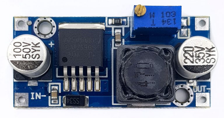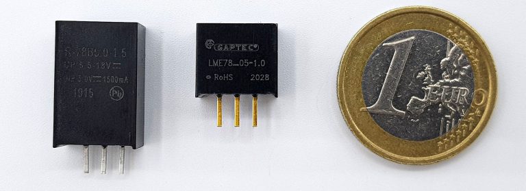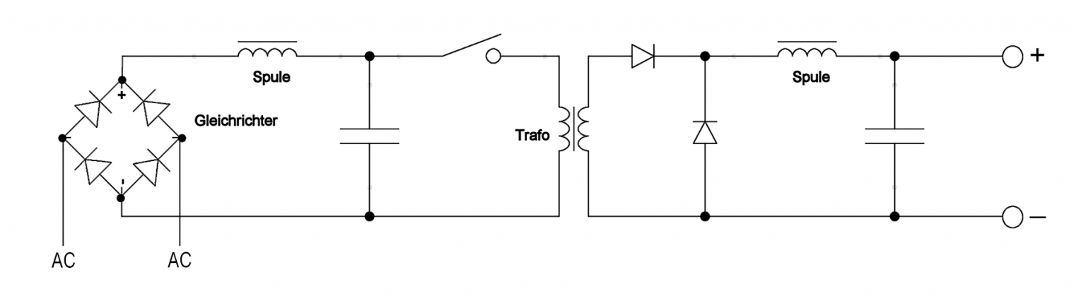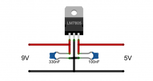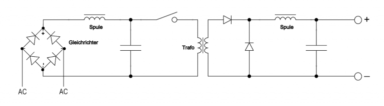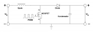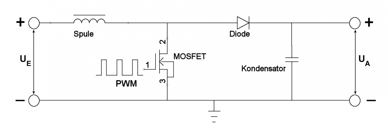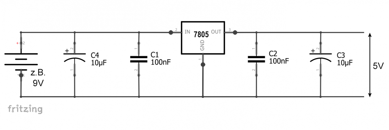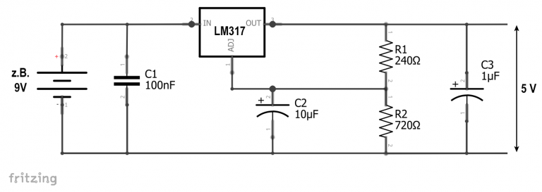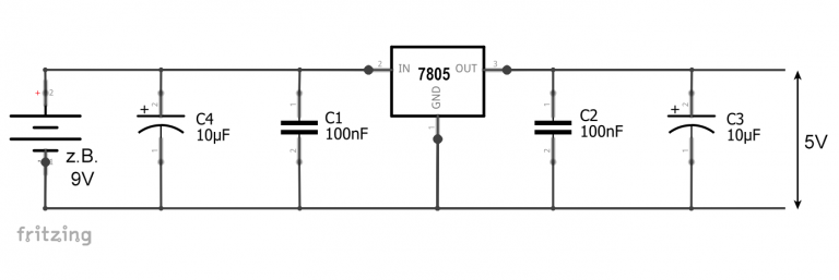 <html> <h2>Über den Beitrag</h2><p>In diesem Beitrag möchte ich verschiedene Optionen für die Spannungsversorgung vorstellen. Dabei geht es weniger um die Energiequellen selbst, wie z.B. Stromnetz, Akkus, Netzteile, Solarelemente, etc. Ich möchte mich vielmehr der Frage widmen, wie ihr unter Verwendung dieser Energiequellen definierte Spannungen einstellen könnt. Im Einzelnen gehe ich auf die folgenden Themen ein:</p><ul><li><a href=„https://wolles-elektronikkiste.de/spannungsversorgung-linear-und-schaltregler#Anker_1“>Spannungsversorgung von bzw. über Boards</a></li><li><a href=„https://wolles-elektronikkiste.de/spannungsversorgung-linear-und-schaltregler#Anker_2“>Lineare Spannungsregler</a><ul><li><a href=„https://wolles-elektronikkiste.de/spannungsversorgung-linear-und-schaltregler#Anker_3“>Festspannungsregler (z.B. L78xx Reihe)</a></li><li><a href=„https://wolles-elektronikkiste.de/spannungsversorgung-linear-und-schaltregler#Anker_4“>Einstellbare Regler (z.B. LM317)</a></li></ul></li><li><a href=„https://wolles-elektronikkiste.de/spannungsversorgung-linear-und-schaltregler#Anker_5“>Schaltregler</a><ul><li><a href=„https://wolles-elektronikkiste.de/spannungsversorgung-linear-und-schaltregler#Anker_6“>Step-down Konverter / Tiefsetzsteller</a></li><li><a href=„https://wolles-elektronikkiste.de/spannungsversorgung-linear-und-schaltregler#Anker_7“>Step-up Konverter / Hochsetzsteller</a></li><li><a href=„https://wolles-elektronikkiste.de/spannungsversorgung-linear-und-schaltregler#Anker_8“>Schaltnetzteile</a></li></ul></li></ul><h2>Spannungsversorgung von bzw. über Boards</h2><p>Wer über Arduino Boards in die Welt der Microcontroller einsteigt, der wird vor allem zu Beginn ihre vorhandene, bequeme Infrastruktur nutzen. Der Strom für das Board wird über die USB Schnittstelle geliefert. Für die Versorgung weiterer Elemente, wie z.B. Sensoren, gibt es angenehmerweise einen 3.3 Volt und einen 5 Volt Ausgang. Letzteres gilt zumindest für die AVR basierten Arduino Boards.</p><p>Über die auf den Boards integrierten Spannungswandler ist auch ein Betrieb mit Versorgungsspannungen zwischen 7 und 12 Volt möglich. Dazu verwendet ihr die „VIN“ Pins oder, wie z.B. beim Arduino UNO, die dafür vorgesehene Buchse.</p><figure class=„wp-block-image size-large“><a href=„https://wolles-elektronikkiste.de/wp-content/uploads/2020/09/nano.jpg“ data-slb-active=„1“ data-slb-asset=„1727242560“ data-slb-internal=„0“ data-slb-group=„7636“><img width=„1024“ height=„582“ src=„https://wolles-elektronikkiste.de/wp-content/uploads/2020/09/nano-1024x582.jpg“ alt=„Spannungsversorgung am Arduino Nano: Eingangspin für die Spannungsversorgung und Spannungswandler“ class=„wp-image-7639“ srcset=„https://wolles-elektronikkiste.de/wp-content/uploads/2020/09/nano-1024x582.jpg 1024w, https://wolles-elektronikkiste.de/wp-content/uploads/2020/09/nano-300x171.jpg 300w, https://wolles-elektronikkiste.de/wp-content/uploads/2020/09/nano-768x437.jpg 768w, https://wolles-elektronikkiste.de/wp-content/uploads/2020/09/nano-1536x873.jpg 1536w, https://wolles-elektronikkiste.de/wp-content/uploads/2020/09/nano-1320x751.jpg 1320w, https://wolles-elektronikkiste.de/wp-content/uploads/2020/09/nano.jpg 1801w“ referrerpolicy=„no-referrer“ /></a><figcaption>Arduino Nano: Eingangspin für die Spannungsversorgung und Spannungswandler</figcaption></figure><p>So weit, so bequem. Spätestens jedoch, wenn ihr</p><ul><li>den „nackten“ Microcontroller betreiben wollt (wie in <a href=„https://wolles-elektronikkiste.de/atmega328p-standalone-betreiben“ target=„_blank“ rel=„noopener noreferrer“>diesem Beitrag</a> über den ATmega328P oder in <a href=„https://wolles-elektronikkiste.de/attiny85-84-45-44-25-24-programmieren“ target=„_blank“ rel=„noopener noreferrer“>diesem</a> über ATtinys), oder</li><li>ihr mehr Strom braucht, als das Board liefern kann (wieviel das ist, dazu kommen wir gleich),</li></ul><p>müsst ihr über das Thema Spannungsversorgung noch einmal nachdenken.</p><h2>Spannungsversorgung mit linearen Spannungsreglern</h2><p>Lineare Spannungsregler (kurz: Linearregler) sind DC/DC-Wandler, die üblicherweise Spannungen im Bereich zwischen 3 und 24 Volt liefern. Der Linearregler vergleicht die Ausgangsspannung mit einem Sollwert. Weicht die Ausgangsspannung ab, so wird sie entsprechend verstärkt. Man unterscheidet dabei lineare Festspannungsregler, die einen festen Spannungswert ausgeben und einstellbare lineare Spannungsregler.</p><p>Die Eingangsspannung muss bei den meisten linearen Spannungsreglern um 2 bis 3 Volt über der gewünschten Ausgangsspannung liegen.</p><h3>Wirkungsgrad linearer Spannungsregler</h3><p>Bei einem linearen Spannungsregler ist der Eingangsstrom I gleich dem Ausgangsstrom. Lediglich die Spannung U ändert sich. Das bedeutet für die Leistung P:</p><div class=„wp-block-katex-display-block katex-eq“ data-katex-display=„true“><pre>P_{Ein}=U_{Ein}\cdot I\;\;\;\text{und}\;\;\; P_{Aus} = U_{Aus}\cdot I</pre></div><div class=„wp-block-katex-display-block katex-eq“ data-katex-display=„true“><pre>P_{V\!erlust} = P_{Ein} - P_{Aus}=(U_{Ein}-U_{Aus})\cdot I</pre></div><p>Für den Wirkungsgrad η gilt:</p><div class=„wp-block-katex-display-block katex-eq“ data-katex-display=„true“><pre>\eta=\frac{U_{Aus}}{U_{Ein}}\cdot100\%</pre></div><p>Sprich: je größer der Spannungsunterschied, desto schlechter der Wirkungsgrad. Und da die Verlustleistung in Wärme umgesetzt wird, kann es notwendig werden, dem Spannungsregler einen Kühlkörper zu spendieren.</p><p>Bei einem Trafo ist das anders. Dort ändert sich auch der Strom, sodass das Produkt aus U und I konstant bleibt. Zumindest gilt das für den <a href=„https://de.wikipedia.org/wiki/Transformator#Idealer_Transformator“ target=„_blank“ rel=„noopener noreferrer“>idealen Transformator</a>.</p><h4>Wieviel Strom können Arduino UN